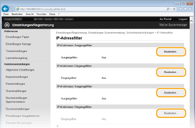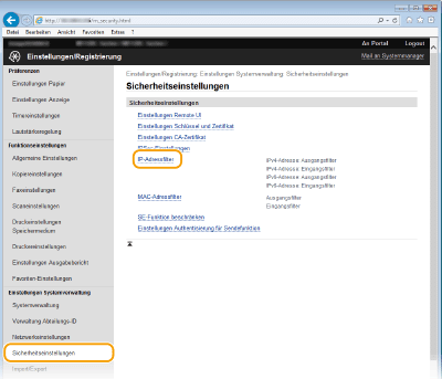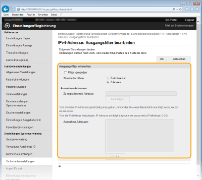 Wenn Sie falsche IP-Adressen eingeben, können Sie eventuell nicht mehr mit Remote UI auf das Gerät zugreifen. In diesem Fall müssen Sie <IPv4-Adressfilter> oder <IPv6-Adressfilter> auf <Aus> setzen. IPv4-Adressfilter IPv6-Adressfilter