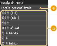 Puede ampliar o reducir las copias utilizando una escala de copia preestablecida, como por ejemplo <A5->A4>, o estableciendo una escala de copia personalizada en incrementos del 1%.