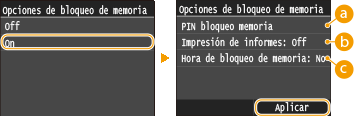 Para guardar los documentos recibidos en la memoria, establezca <Opciones de bloqueo de memoria> en <On>. También puede especificar ajustes opcionales como la opción de seguridad, que requiere una contraseña para poder desbloquear la función, y la opción de tiempo, que especifica el periodo de tiempo del día durante el cual se almacenarán en la memoria los documentos recibidos.