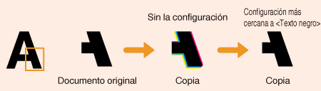 Si los resultados de copia del texto negro o ennegrecido no son los esperados, puede mejorar la reproducibilidad del color con este ajuste. El valor de este ajuste puede establecerse de forma independiente en el alimentador y en el cristal de la platina.