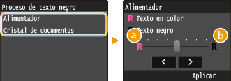 <Menú>  <Ajuste/Mantenimiento>  <Proceso de texto negro para color>  Seleccione <Alimentador> o <Cristal de documentos>  Ajuste el valor  <Aplicar>