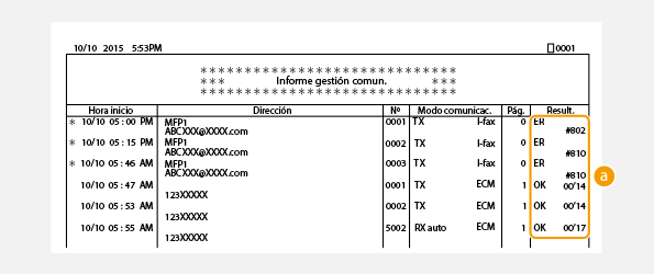 Cuando aparece un código de error). Para el e-mail, el Informe de gestión de comunicaciones indica el resultado de transmisión entre el equipo y el servidor de correo, no entre el equipo y la dirección de destino.