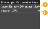 Seleccione <On> para imprimir los informes enviados y recibidos por separado, u <Off> para imprimir ambos informes en una hoja.