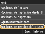 Todas las opciones de gestión del sistema se muestran con descripciones breves. Las opciones predeterminadas aparecen marcadas con una cruz (  ).