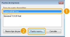 Seleccione [Canon MFNP Port] en [Tipos de puerto disponibles] y haga clic en [Puerto nuevo].
