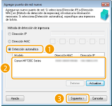 Haga clic en [Detección automática], seleccione el equipo cuando se detecte y haga clic en [Siguiente].