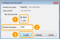 Haga clic en el botón de opción [LPR] o [RAW] en [Tipo de protocolo], cambie el número en el cuadro de texto [Número de puerto] según sea necesario y, a continuación, haga clic en [Aceptar].