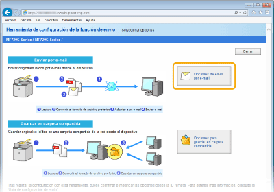 Si utiliza la IU remota en lugar de la Herramienta de configuración de la función de envío (Configuración de las opciones de comunicación de e-mail/I-Fax) podrá especificar opciones más detalladas. La Herramienta de configuración de la función de envío resulta útil a aquellos usuarios que desean realizar el proceso de configuración de una forma sencilla.