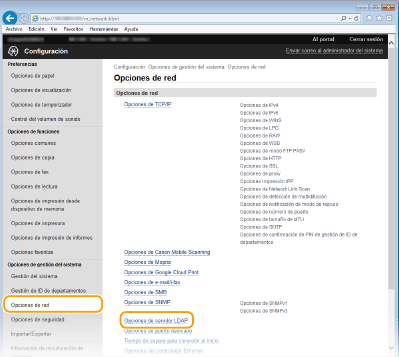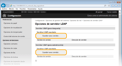 Haga clic en [Guardar nuevo servidor] para [Servidor LDAP (para búsqueda)] o [Servidor LDAP (para autenticación)].