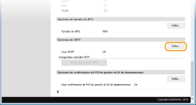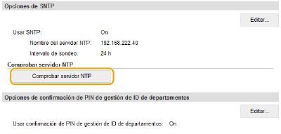 Prueba de comunicación con el servidor NTP/SNTPPodrá visualizar el estado de comunicación con el servidor registrado haciendo clic en [Configuración]