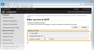 Protocolo simple de tiempo de redes (SNTP) le permite ajustar el reloj del sistema utilizando el servidor de tiempo de la red. El protocolo se utiliza habitualmente para sincronizar el equipo y un servidor, como por ejemplo, cuando el equipo debe acceder a un servidor LDAP con la autenticación de seguridad habilitada. La hora se ajusta en función de la Hora universal coordinada (UTC), por lo que debe especificar la zona horaria antes de configurar SNTP (Ajustes de fecha/hora). Las opciones de SNTP pueden especificarse a través de la IU remota.