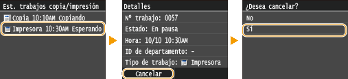Cancelación desde la IU remotaPuede cancelar la impresión desde la página [Estado de trabajos] de la IU remota: Comprobación del estado actual de los documentos de impresión