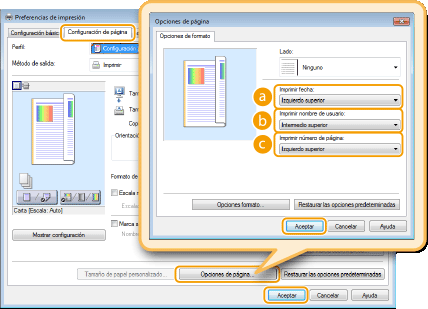 Seleccione la posición de impresión de la fecha de impresión, el nombre de usuario o el número de página