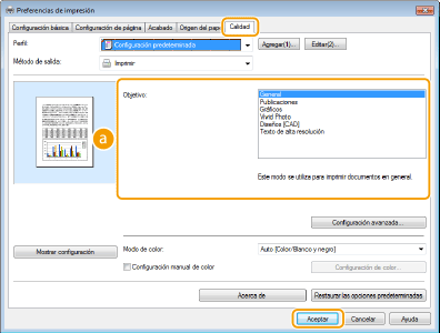 Seleccione una opción que se adapte al tipo de documento o al propósito de la impresión. Por ejemplo, seleccione [General] para el uso general, o seleccione [Vivid Photo] cuando desee imprimir imágenes fotográficas con una calidad de impresión óptima.