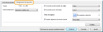 Haga clic en la pestaña [Configuración de impresión] para mostrar la pantalla de especificación de las opciones de impresión, como el número de copias o la impresión a una cara/doble cara. Las opciones especificadas aquí se aplican a todo el trabajo de impresión.