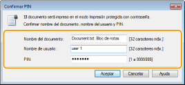 Introduzca el [Nombre del documento], el [Nombre de usuario] y el [PIN] y haga clic en [Aceptar].