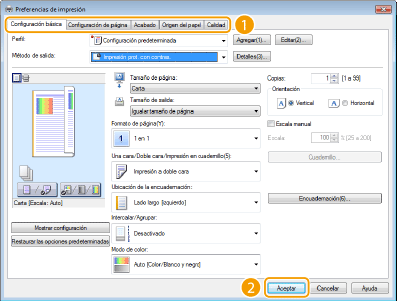 Haga clic en las pestañas [Configuración básica], [Configuración de página], [Acabado], [Origen del papel] o [Calidad] para especificar las opciones de impresión en cada pantalla según sea necesario.