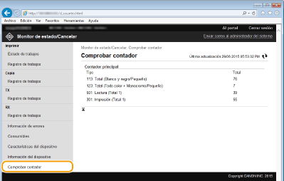 Se muestra el número total de páginas impresas con las funciones de copia, impresión y fax.