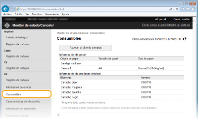 Se muestra información sobre el tamaño y el tipo de papel para el origen del papel, el número de modelo del cartucho de tóner, etc. También podrá hacer clic en [Comprobar detalles de consumibles] en la