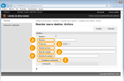 Podrá registrar o editar la libreta de direcciones del equipo utilizando el ordenador. Establezca la carpeta compartida o la dirección del servidor de FTP aquí.