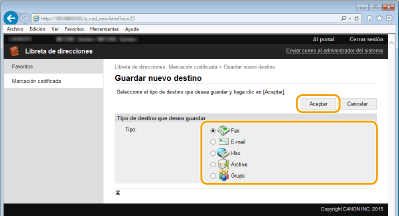 Seleccione [Tipo de destino que desea guardar] y haga clic en [Aceptar].