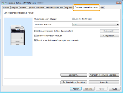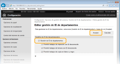 Seleccione la casilla de verificación [Utilizar Administración de ID de departamento] y haga clic en [Configuración] a la derecha.