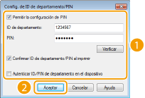 Marque esta casilla de verificación para que se muestre la pantalla emergente [Confirmar ID de departamento y PIN] cada vez que imprima o envíe un fax desde un ordenador.