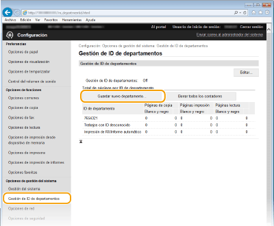 Si desea que el número vuelva a ser cero, haga clic en el vínculo de texto correspondiente situado debajo de [ID de departamento] y haga clic en [Borrar contador]