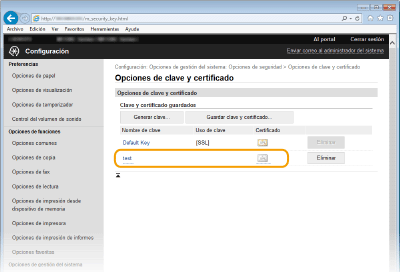 Los pares de claves no pueden eliminarse si se utilizan actualmente para algún fin, como cuando aparecen "[SSL]" o "[IEEE 802.1X]" en [Uso de clave]. En este caso, deshabilite la función o sustituya el par de claves antes de eliminarlo.