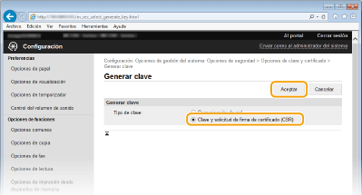 Seleccione [Clave y solicitud de firma de certificado (CSR)] y haga clic en [Aceptar].