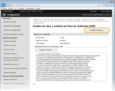 Haga clic en [Examinar], especifique el archivo para la solicitud de firma del certificado y haga clic en [Guardar].