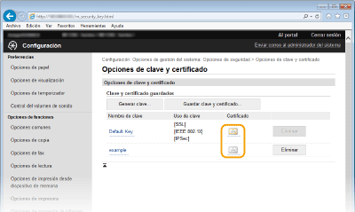 [Opciones de clave y certificado] (para los pares de claves) u [Opciones de certificado de CA] (para los certificados de CA).