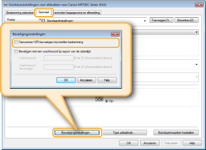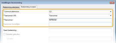Als u [Faxnummer/URI bevestigen bij instellen bestemming] hebt geselecteerd in het dialoogvenster dat wordt geopend na het aanklikken van [Beveiligingsinstellingen] op het tabblad [Speciaal], moet u ook een nummer invoeren bij [Faxnummer bevestigen] of [URI bevestigen]. Klik voor meer informatie op [Help] in het scherm van het faxstuurprogramma.