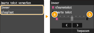 Als de kopieerresultaten van zwarte of zwartachtige tekst niet naar wens zijn, kunt u de reproduceerbaarheid van de kleuren aanpassen met deze correctie. Deze correctiewaarde kan onafhankelijk worden ingesteld in de documentinvoer en de glasplaat.
