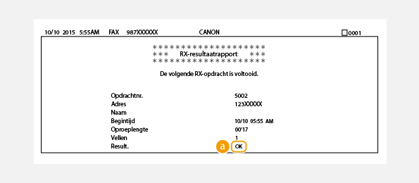 U kunt de logboeken van ontvangen fax- en I-faxdocumenten controleren door een RX-resultaatrapport af te drukken. U kunt het rapport afdrukken na elke transmissie of alleen als er een ontvangstfout optreedt.