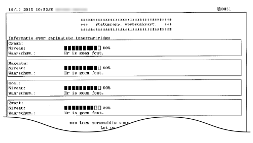 <Menu> <Uitvoerrapport> <Lijst afdrukken> <Statusrapport verbruiksartikelen> Controleer dat papier van het formaat en de soort dat op het scherm wordt weergegeven, in het apparaat is geplaatst <OK> <Ja>