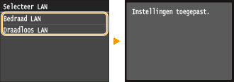 Wanneer u een besluit hebt genomen over de verbinding tussen het apparaat en de computer via een bedraad of een draadloos netwerk, selecteert u bedraad of draadloos met het bedieningspaneel. NB als u de instelling wijzigt van <Bedraad LAN> in <Draadloos LAN> of vice versa, zult u de installatie van MF-stuurprogramma's die op uw computer zijn geïnstalleerd, ongedaan moeten maken en ze vervolgens opnieuw moeten installeren. Zie de Installatiehandleiding MF-stuurprogramma voor nadere bijzonderheden.