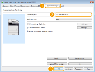 Als u werkt met de MF729Cx / MF728Cdw / MF724Cdw, kunt u niet alleen het printerstuurprogramma UFRII LT gebruiken, maar ook PCL5c en PCL6. De beschikbare afdrukinstellingen verschillen per printerstuurprogramma. Klik voor meer informatie op [Help] in een scherm van het printerstuurprogramma.
