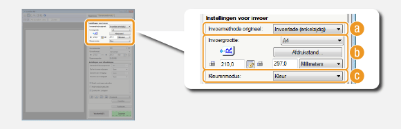 Geef de documentinvoermethode (glasplaat of documentinvoer), het documentformaat, de kleurenmodus en andere instellingen op.