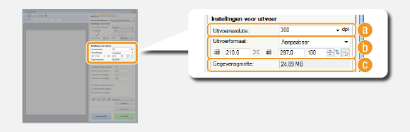 Als u de uitvoerresolutie verdubbelt, neemt de grootte van het afbeeldingsbestand toe met een factor 4. Als het bestand te groot is, kan er een geheugenfout of andere fout optreden. Kies de resolutie die minimaal vereist is voor het beoogde gebruik.