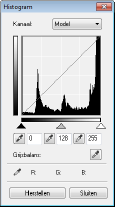 Een histogram is een grafiek waarin de verdeling van helderheid binnen een afbeelding wordt uitgezet. U kunt de afbeelding aanpassen met behulp van de voorbeeldafbeelding en het histogram. Geef het deel van de afbeelding op dat u het lichtst (of het donkerst) wilt maken in de voorbeeldafbeelding, zodat de helderheid van de originele afbeelding automatisch wordt aangepast aan het opgegeven deel, dat als gemiddelde dient. U kunt op dezelfde manier ook de balans aanpassen met de helderheid van de middelste kleurtint als het gemiddelde.