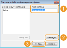 Het scherm [Tintcurve-instellingen toevoegen/verwijderen] of [Drempelinstellingen toevoegen/verwijderen] wordt weergegeven.