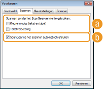 Het scherm [ScanGear MF] wordt automatisch gesloten zodra het scannen is voltooid. Het scherm wordt bij sommige programma's mogelijk automatisch gesloten ongeacht deze instelling.