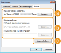 U kunt aangeven welke muziek of geluiden het apparaat moet afspelen tijdens het scannen of wanneer het scannen is voltooid. Klik op [Bladeren] om een bestand dat moet worden afgespeeld, op te geven. De volgende bestandsindelingen (extensies) worden ondersteund: