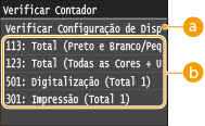 ), é apresentado o ecrã <Verificar Contador>. Neste ecrã, pode ver a contagem de impressões, bem como o número de série da máquina e da configuração da máquina.