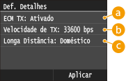 Também pode especificar <ECM TX> e <Velocidade de TX> a partir de <Menu>  <Configurações de Fax>. No entanto, as definições efetuadas a partir de <Catálogo> são ativadas para as definições detalhadas de destinos registados no livro de endereços.