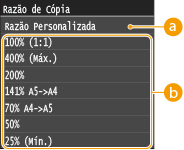 Pode ampliar ou reduzir cópias utilizando um rácio de cópia predefinido, como <A5->A4>, ou definindo um rácio de cópia personalizado em incrementos de 1%.