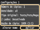 Pode registar até quatro combinações de definições de cópia utilizadas frequentemente. Selecionando simplesmente uma combinação de definições registada quando for preciso, não será necessário configurar as mesmas definições sempre que quiser fazer cópias, como, por exemplo, se definir frequentemente o número de cópias como 5, definir <Apagar Moldura> como <Ativado> e aumentar a nitidez para copiar. Também pode visualizar as definições como botões de atalho no ecrã <Início>.
