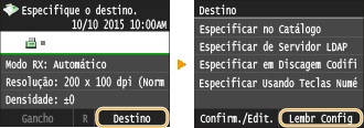 Pode selecionar um destino de entre os últimos três destinos utilizados. Quando especifica um destino utilizado anteriormente, a máquina configura também as mesmas definições de fax (por exemplo, a densidade) que utilizou da última vez que enviou documentos para o destino em questão.