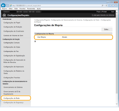Inicie sessão na UI Remota, no modo de administrador de sistema ( Iniciar a UI Remota)  [Configurações/Registro]  [Configurações de Rede]  [Configurações de Mopria]  [Editar]  Certifique-se de que a caixa de verificação [Usar Mopria] está selecionada  [OK]